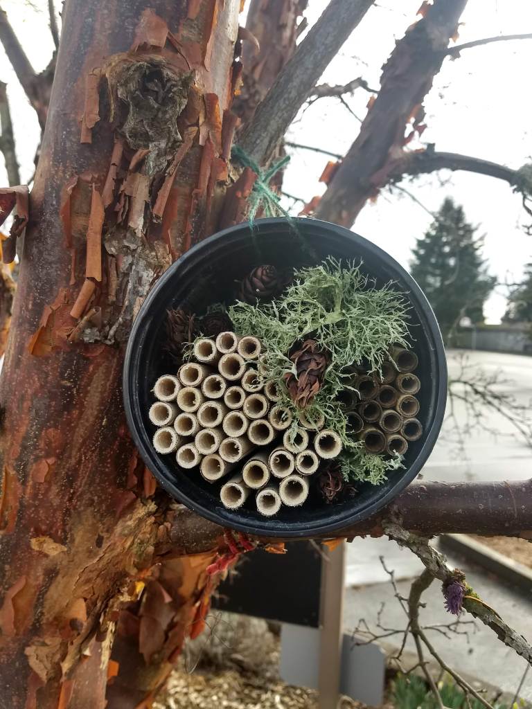 Creating a place where pollinators can live can be a bit more tricky. “Pollinator hotels” are generally used for nesting. Which materials you use for pollinator hotels depends on which pollinators you want to attract. Mason bees, for example, come out in early Spring, around March, and need tubes about ¼ inches wide and 3-6 inches deep. Leafcutter bees, however, come out in the summer and need tubes or holes only 8 millimeters wide! Other materials such as dried leaves and moss can also be used as nesting material and to add an interesting look to your design.