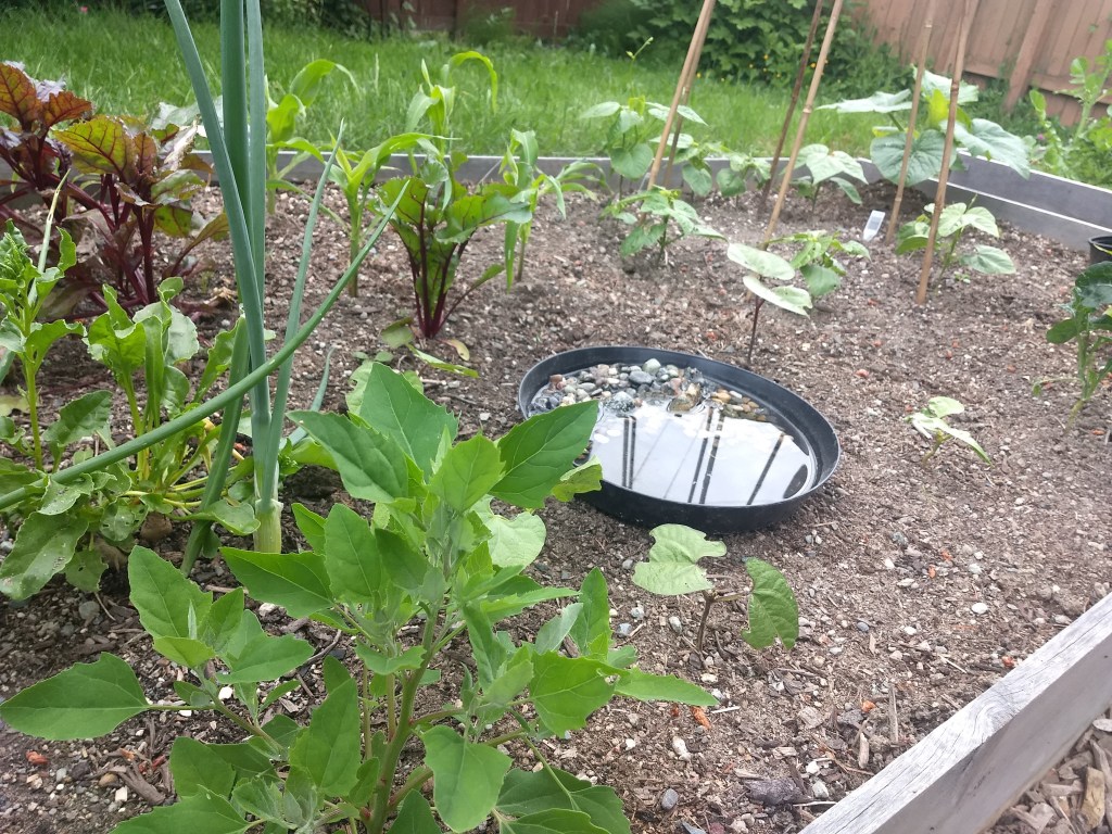 Like humans and other animals, pollinators need a water source! When thinking about water for pollinators, remember bees can’t really swim! When their wings get wet, they are unable to take off and fly again until they dry off. Therefore, you don’t want to keep a deep bowl out as a water source for bees. One thing you can do is put marbles or rocks in your bowl for the bees to land on and sip from. Using a shallow dish like a plant saucer works well. First, find some rocks from the garden, and arrange the rocks in the dish. Then fill the container with water just up to the level of the rocks. Place it somewhere in the shade so the water doesn’t evaporate too quickly.